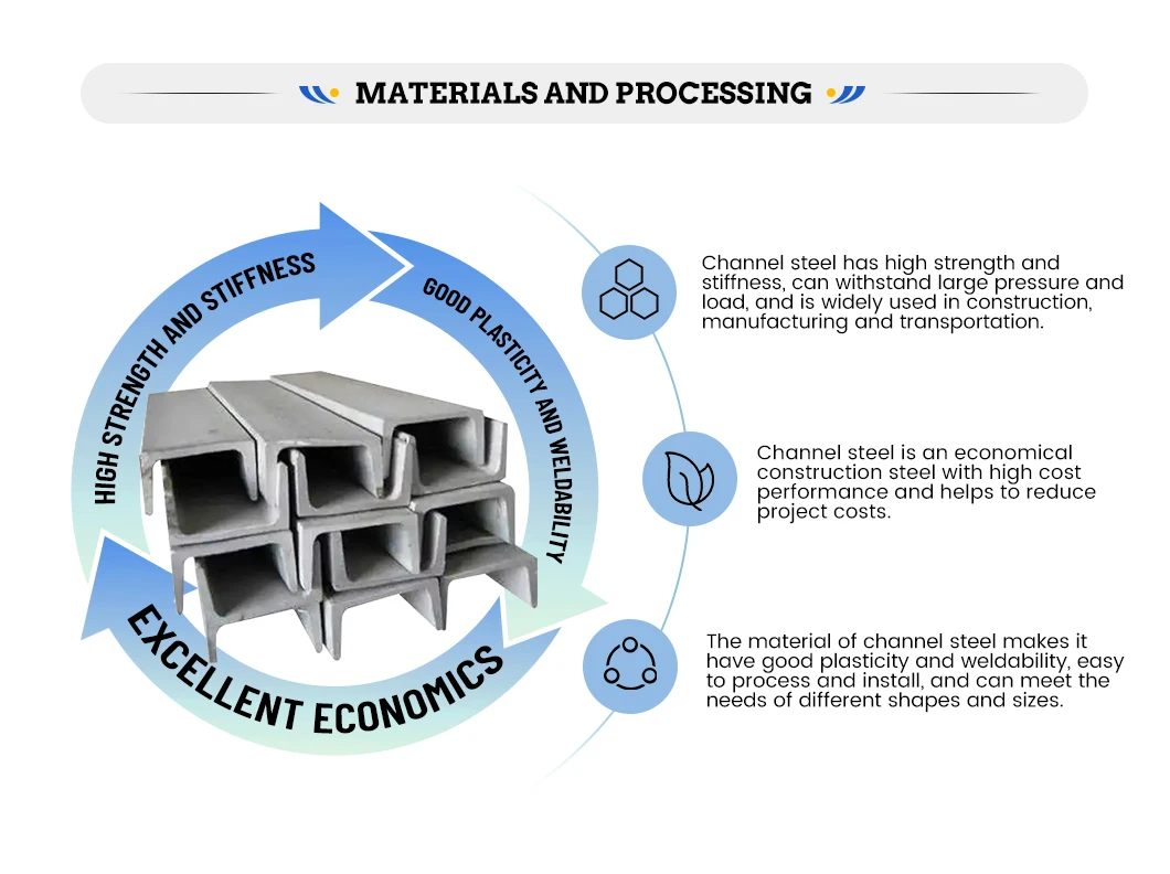 High strength and high load-bearing capacity: our channel steel has high tensile strength and yield strength, can with stand large load and pressure, suitable for supporting members and connectors in building structures, improve the stability of the overall structure. Good processing performance and adaptability: our channel steel is easy to cut, bend and weld, with good plasticity and weldability, can adapt to different construction needs, improve construction efficiency. High cost effectiveness and environmental protection: compared with other metal materials, channel steel has lower cost and higher cost performance, which helps to reduce project costs. In addition, channel steel is an environmentally friendly material that can be recycled, reducing the damage to the environment.
