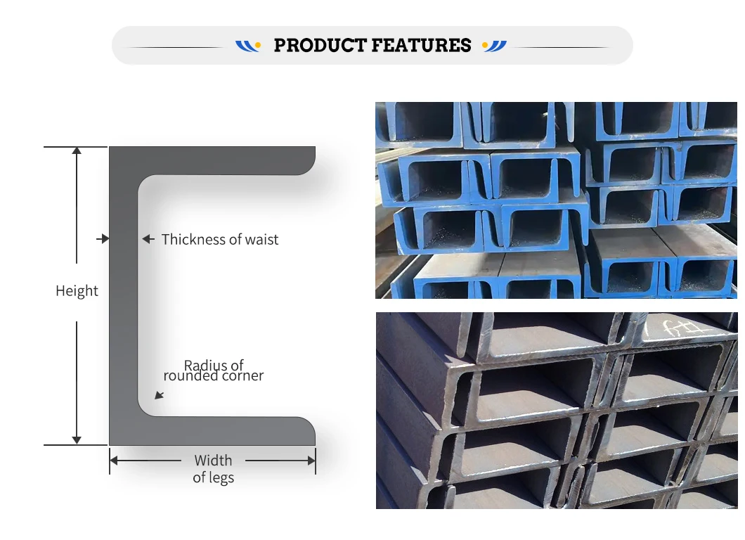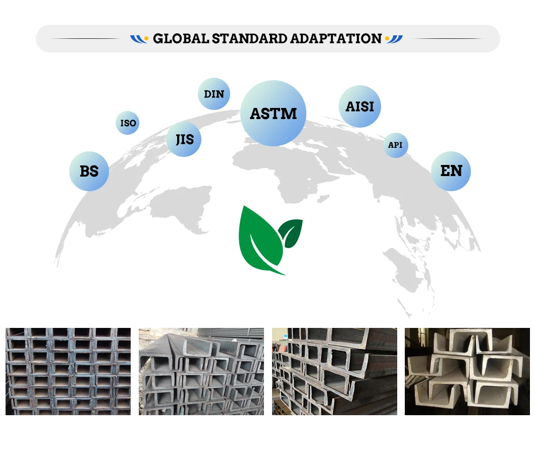 1. Shape & Structure - Resembles the letter "C"or "U" when viewed from the end. - Consists of a vertical web and two horizontal flanges(top and bottom). - Available in equal flange and unequal flange designs. 2. Material Types - Hot-rolled channel steel: Strong and durable, commonly used in construction. - Cold-formed channel steel: Lighter, used in lightweight structures. - Galvanized channel steel: Corrosion-resistant, ideal for outdoor use. 3. Standard Specifications - Standards (e.g., EN, DIN, JIS, GB, ASTM A36, A572) - Common sizes: Depth (50mm–400mm), Flange width (30mm–100mm), Thickness (3mm–20mm).