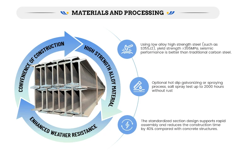 High strength alloy material: using low alloy high strength steel (such as S355J2), yield strength ≥355MPa, seismic performance is better than traditional carbon steel. Enhanced weather resistance: optional hot dip galvanizing or spraying process, salt spray test up to 2000 hours without rust, suitable for offshore platforms, chemical equipment and other harsh environments. Construction convenience: standardized section design supports rapid assembly, and the construction period is 40% shorter than that of concrete structures. Intelligent welding technology: dual-head synchronous welding system is adopted to achieve 25kg/h high-speed welding and improve efficiency by 200%. Section performance optimization: according to JIS G3192 standard, the bending capacity of H-beam steel is 10% higher than that of I-beam steel of the same weight, and the tortuosity stiffness is 20% higher.International standard adaptation ability