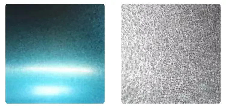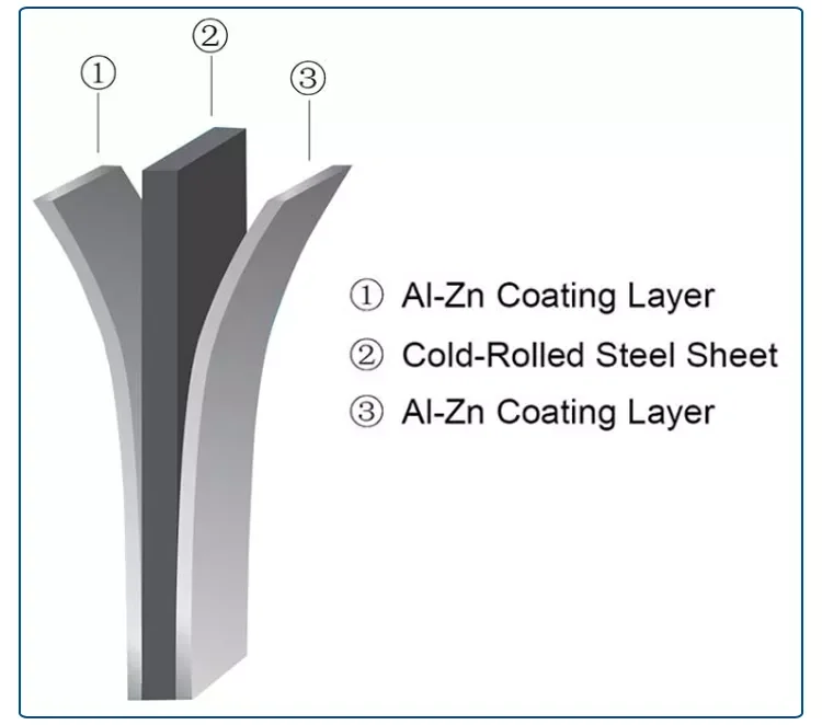 Galvalume steel is also called Aluminum-Zinc Alloy Coated Steel, Zincalume steel, aluminized zinc steel (aluzinc steel), SGLC, The galvalume metal is composed of 55% aluminium, 43.4% zinc and 1.6% silicon solidified at 600 ~C. Its whole structure consists of aluminium-iron-silicon-zinc, forming a compact quaternary crystal alloy. The surface of the galvalume steel sheet is characterized by smooth, flat and gorgeous stars, and its base color is silver white. The special coating structure makes it have excellent corrosion resistance. The normal service life of galvalume steel sheet is up to 25a, and its heat resistance is good. It can be used in high temperature environment at 315 C. The adhesion between coating and paint film is good, and it has good processing performance. It can be punched, sheared and welded. The surface conductivity is very good.